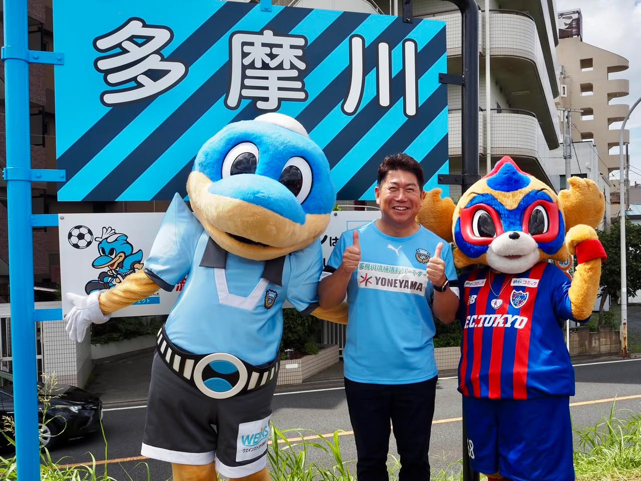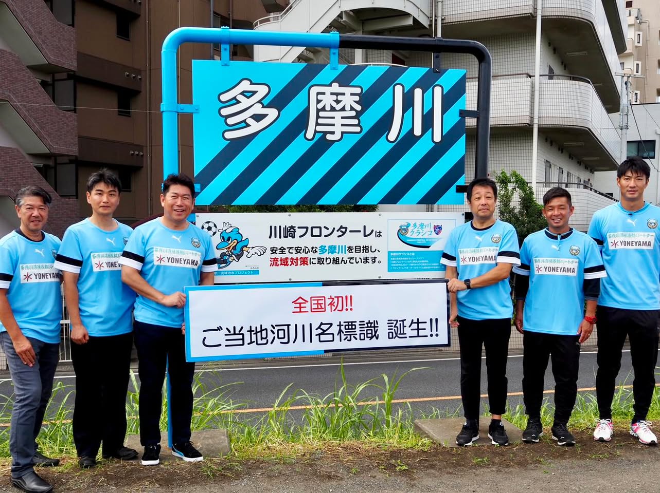 金曜日の多摩川クラシコ、川崎フロンターレとFC東京との試合を前に多摩川の河川名標識がフロンターレカラーに!対岸の東京側にもFC東京カラーの標識が。