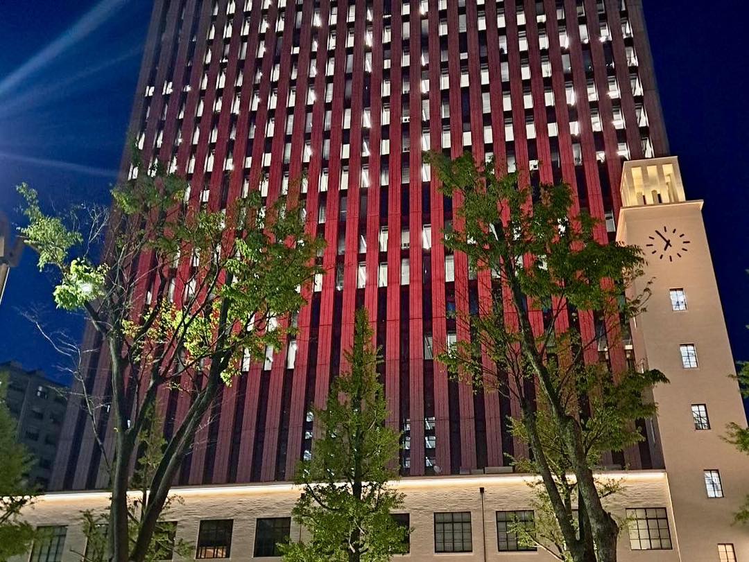 新しい本庁舎もお祝いのライトアップでレッドウェーブ色に!